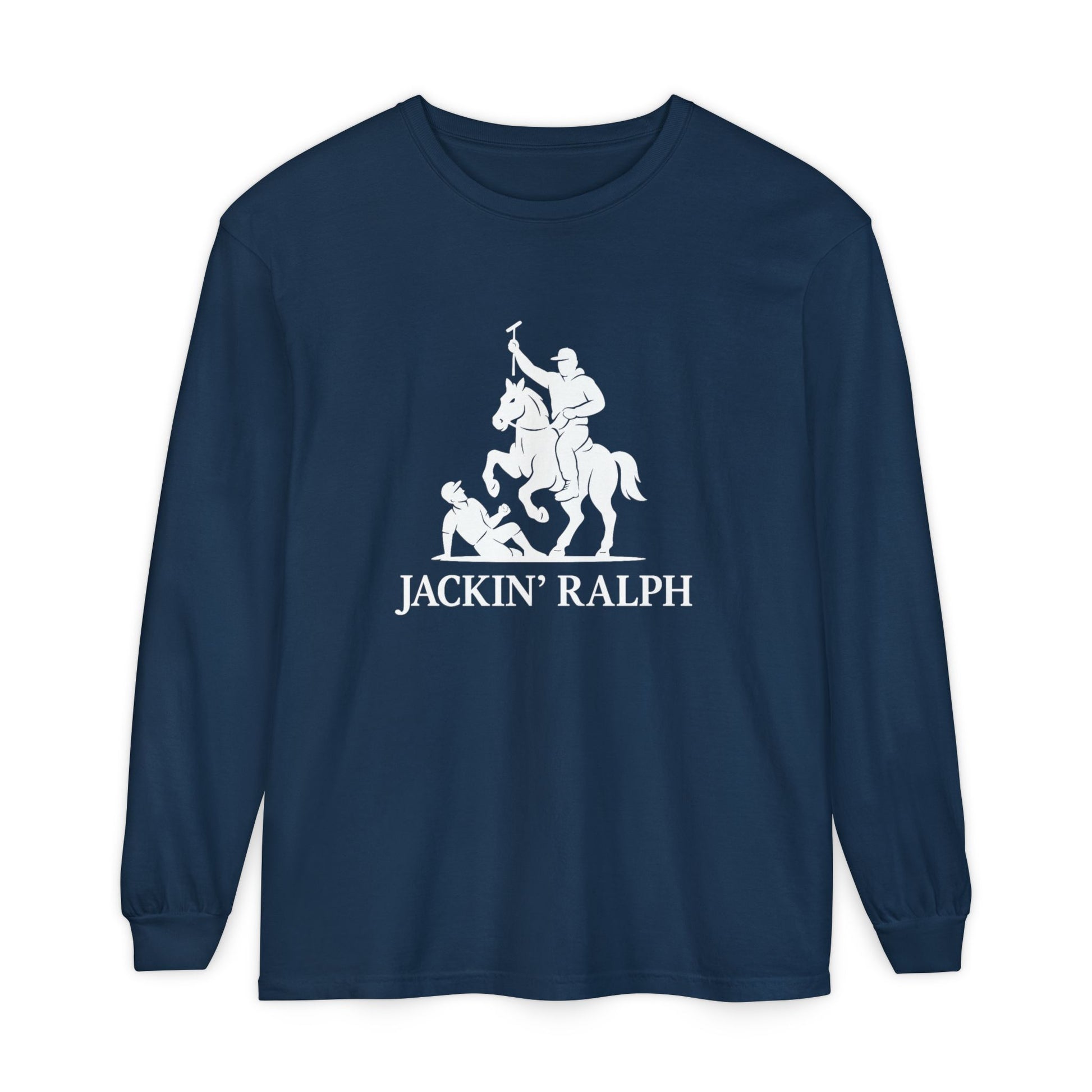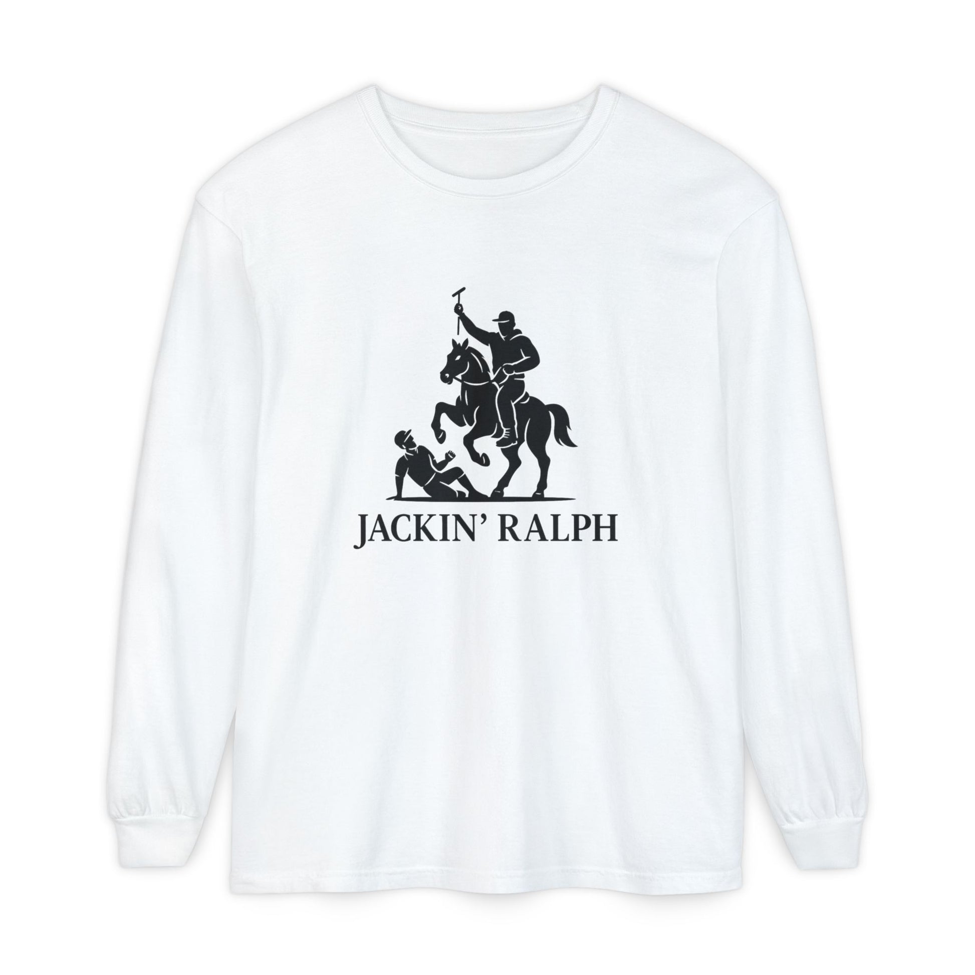 A soft, garment-dyed long sleeve that pairs everyday comfort with a bold, vintage-inspired emblem. The classic fit and medium-weight 100% ring-spun cotton feel lived-in from the first wear, while ribbed cuffs and reinforced hems keep the silhouette tidy through repeated use. The front artwork — a striking equestrian crest with the text “JACKIN’ RALPH” — gives this shirt a irreverent, old-world-meets-street attitude that lands easily under a denim jacket or layered for cooler evenings. It’s the kind of long sleeve you reach for when you want comfort without blending in: relaxed, durable, and quietly confident.