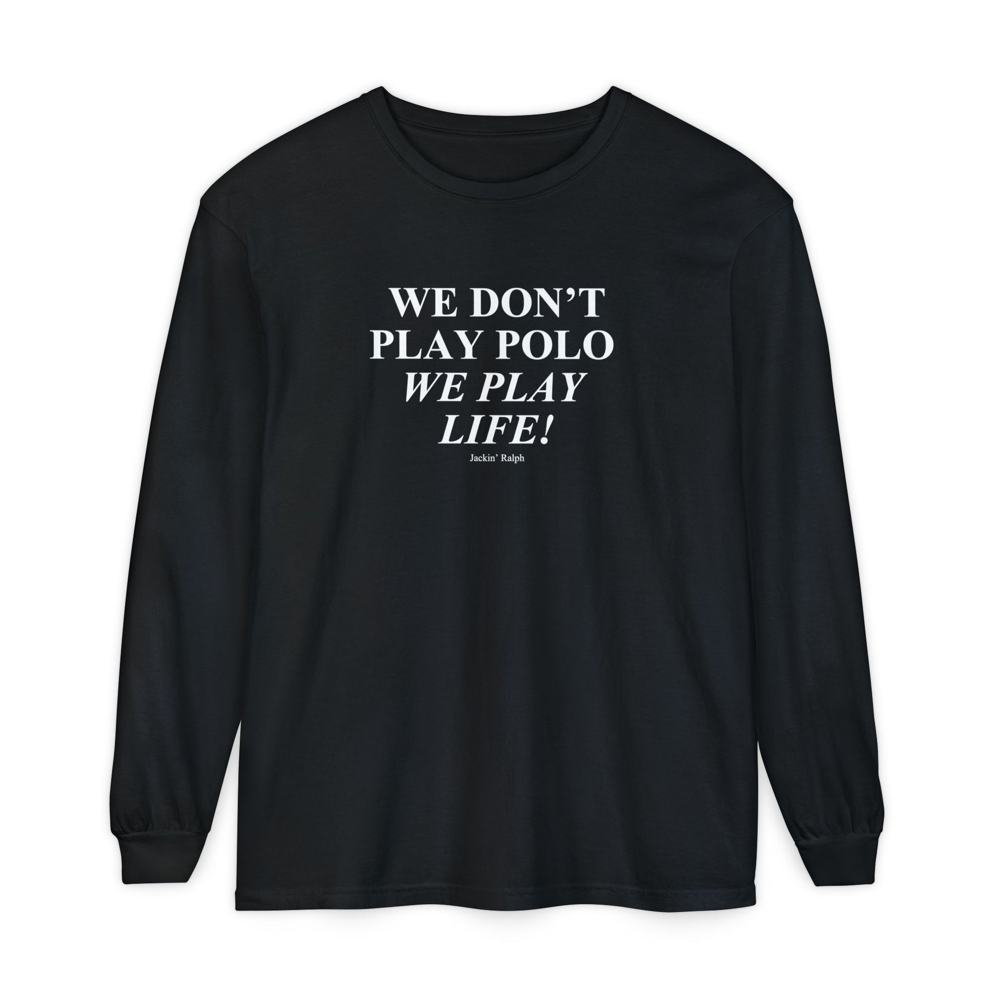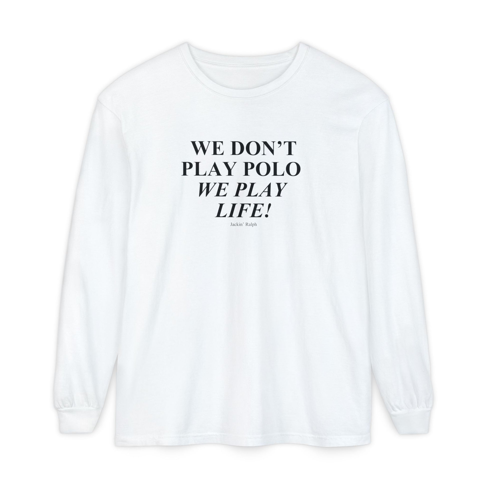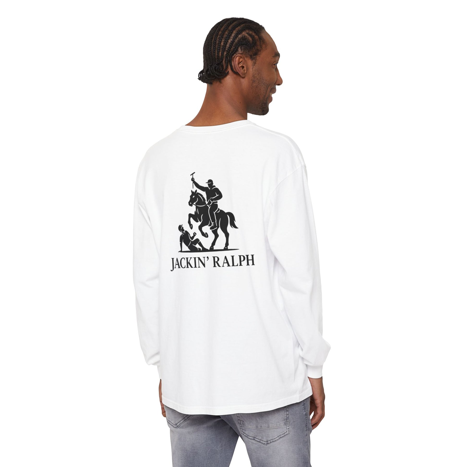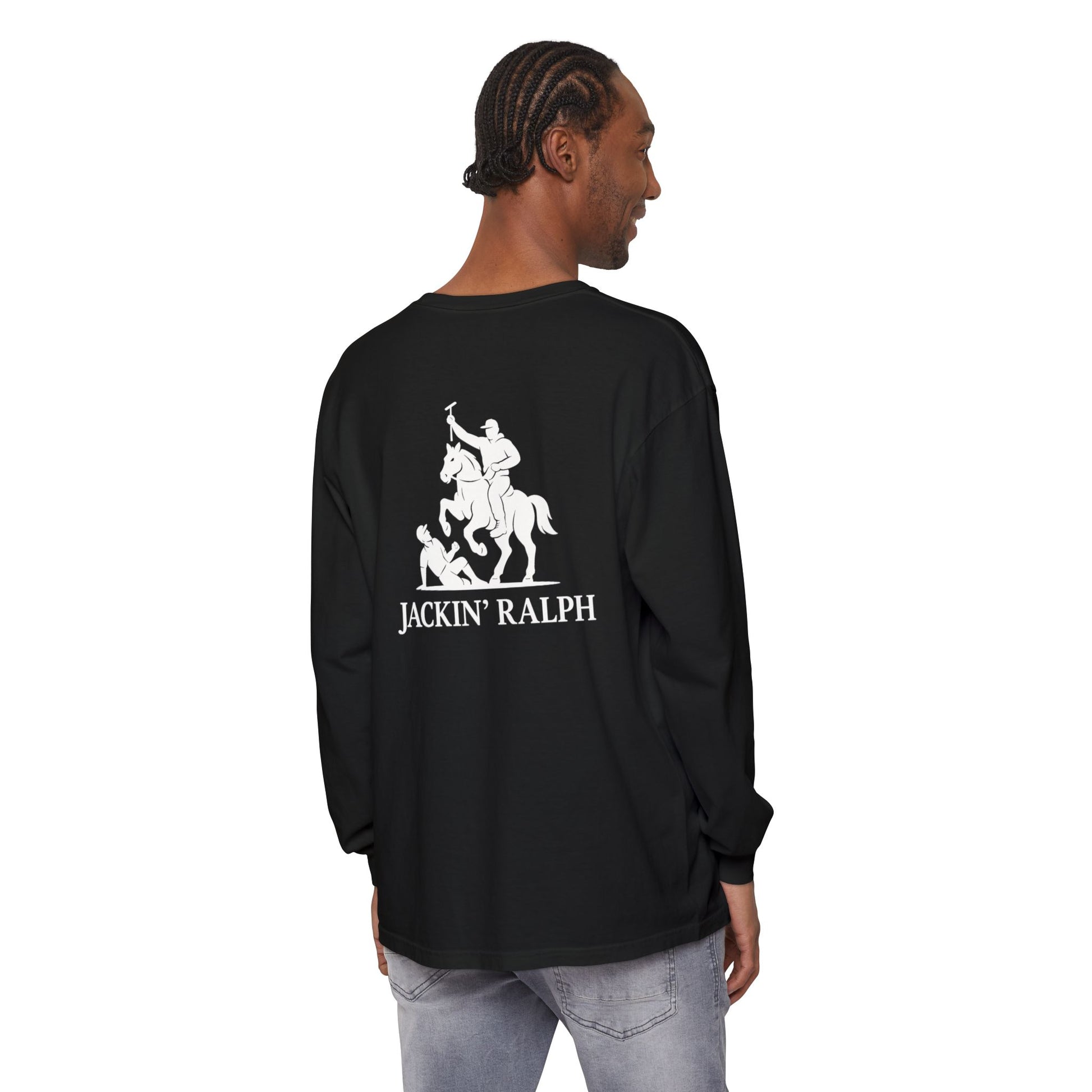 A soft, garment-dyed long sleeve that pairs everyday comfort with a bold, vintage-inspired emblem. The classic fit and medium-weight 100% ring-spun cotton feel lived-in from the first wear, while ribbed cuffs and reinforced hems keep the silhouette tidy through repeated use. The front artwork — a striking equestrian crest with the text “JACKIN’ RALPH” — gives this shirt a irreverent, old-world-meets-street attitude that lands easily under a denim jacket or layered for cooler evenings. It’s the kind of long sleeve you reach for when you want comfort without blending in: relaxed, durable, and quietly confident.